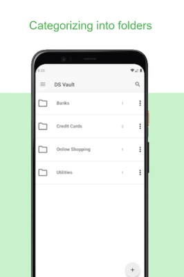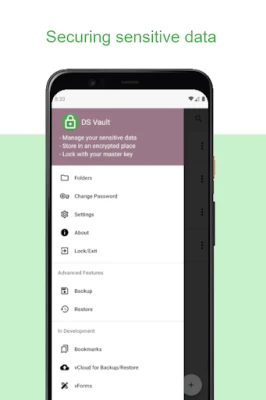 DS Vault is a secure vault app to provide features of storing user’s sensitive data in a secure 256-bit AES encryption place on the device, organizing data in hierarchical structure (folder, record and field), and securing the vault with user’s master key.