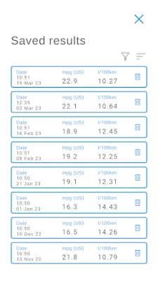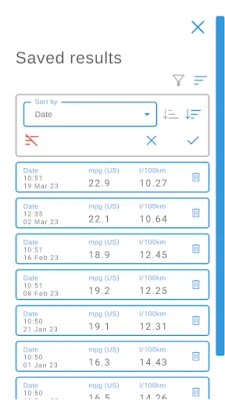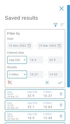 FCC not only converts but also helps you keep track of your fuel consumption. You can save your results to a special list, which allows you to easily monitor your progress. Thanks to advanced sorting and filtering functions, you can quickly find the necessary entries and analyze your data. This is the ideal tool for those who strive for fuel economy and perform a detailed fuel consumption calculation.